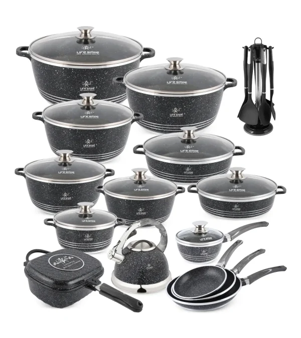 - 31-Piece Set: Includes cookware, lids, kettle, pans, and a full range of kitchen tools for all your cooking needs.